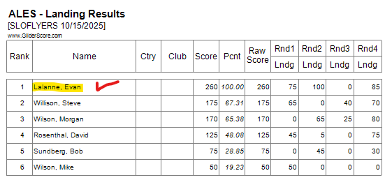 No rain, light wind, a perfect morning…what’s not to like? Well for starters, very little lift. Once again Evan made the most of it with both best Overall and best Landing. Way to go Evan…Steve