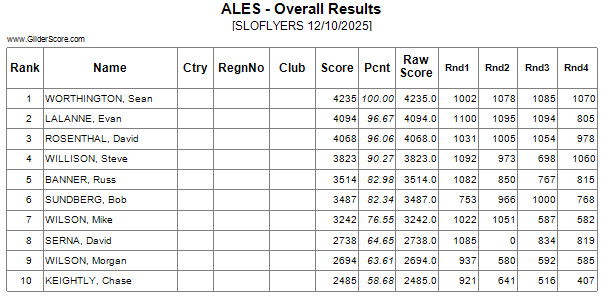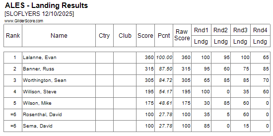 It’s been a good year for Sloflyers ALES and today was a topper. It couldn’t have been nicer and I think everyone would agree it was a great/fun contest. The lift started out great in the first round but got progressively more challenging as the morning progressed. Sean had strong performances in each round and took first overall…not a bad way to end 2025! I can’t wait to see what 2026 ALES brings us…Steve